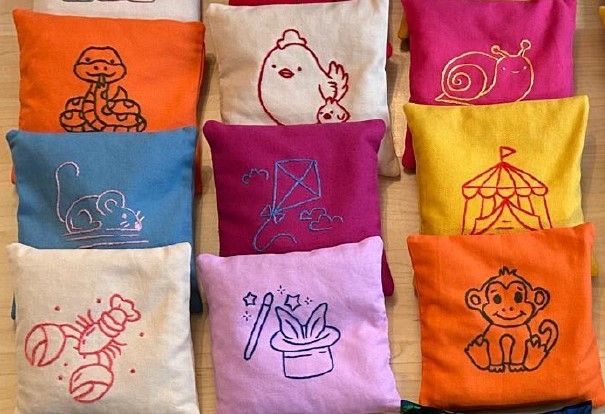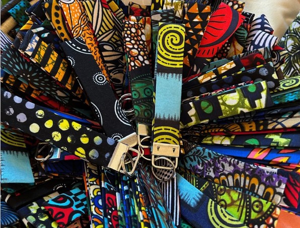 Selbstgestickte Kirschkernkissen und Schlüsselanhänger aus ugandischen Stoffen